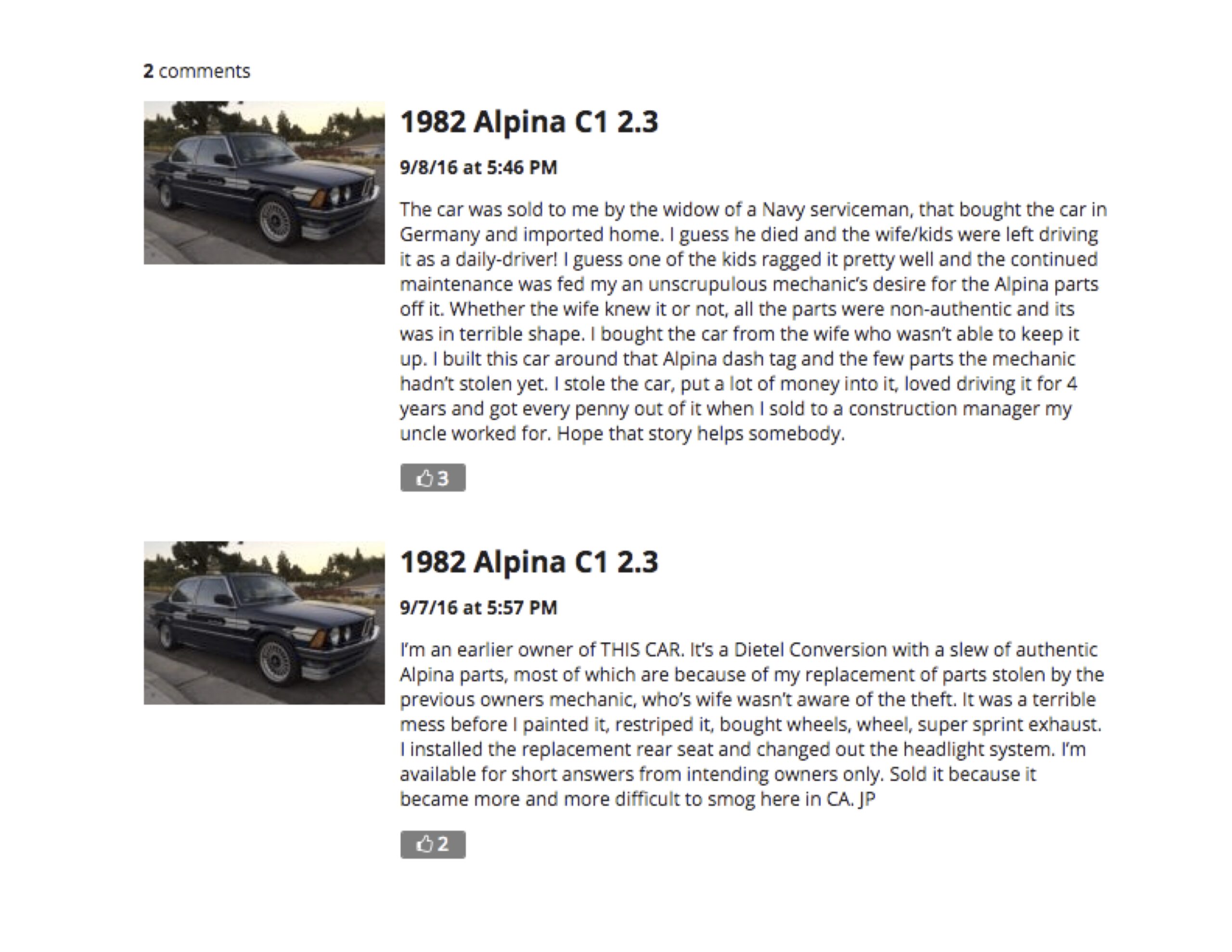 In his first of two posts, the previous owner said the car was a “Dietel [c]onversion with a slew of authentic Alpina parts, most of which” he put on after the originals were removed by the unethical mechanic. He explained he bought it from the widow of a servicemen who had the car imported and he had to replace the wheels, steering wheel, and repaint the car. In his second post he reported he got the car “in terrible shape” and that he “built this car around that Alpina dash tag and the few parts the mechanic hadn’t stolen.”